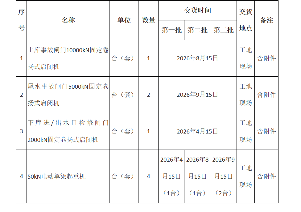 招标范围招标项目划分为1个标段,具体为:启闭机设备-启闭设备制造标(CHDTDZ023/18-QT-01501):浙江华电衢州乌溪江298M混合式抽水蓄能电站上库事故闸门10000KN固定卷扬式启闭机1套及其附属设备、安全管理系统;尾水事故闸门5000KN固定卷扬式启闭机2套及其附属设备安全管理系统;下库进/出水口检修闸门2000KN固定卷扬式启闭机1套及其附属设备、安全管理系统;50kN电动单梁起重机4套及其附属设备。包括设备的设计、制造、工厂试验、装配、包装、运输、交货、验收、资料提交、人员培训、技术服务(含工地现场)及设计联络等。