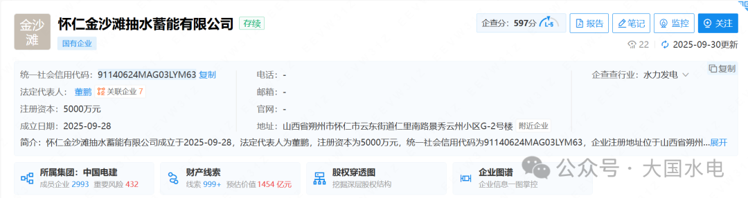 近日,CPEM大国水电获悉中国电建集团北京勘测设计研究院有限公司于山西省朔州市怀仁市成立一家抽水蓄能公司:怀仁金沙滩抽水蓄能有限公司,注册资金5000万元,法人董鹏,中国电建集团北京勘测设计研究院有限公司全资控股。