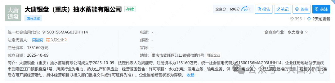 CPEM大国水电获悉中国大唐于重庆成立一家抽水蓄能公司:大唐银盘(重庆)抽水蓄能有限公司,法人周能奇。大唐银盘(重庆)抽水蓄能有限公司成立于2025年10月9日,注册地位于重庆市武隆区江口镇银盘路1号,注册资本135160万人民币,法定代表人为周能奇。由中国大唐集团旗下大唐国际发电股份有限公司、重庆发展能源有限公司、重庆武隆城市发展(集团)有限公司共同持股。