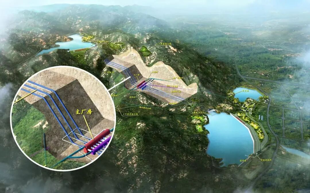 抽水蓄能电站效果图中蓝色部分的中段为大倾角斜井。