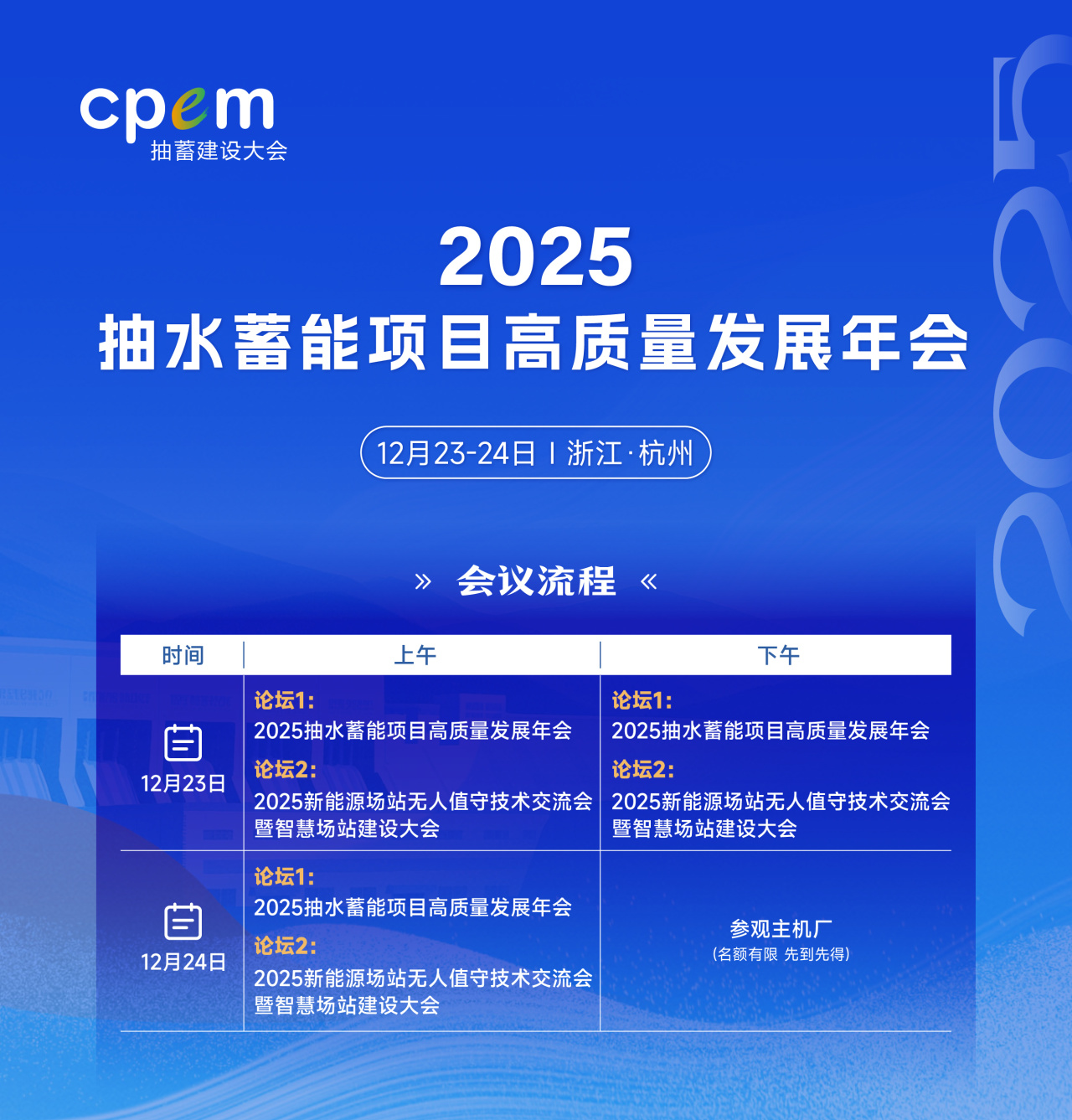 2025年12月23-24日,“2025抽水蓄能项目高质量发展年会”将在杭州市盛大召开!同期举办“2025 新能源智慧场站建设大会暨新能源场站无人值守技术交流会”。