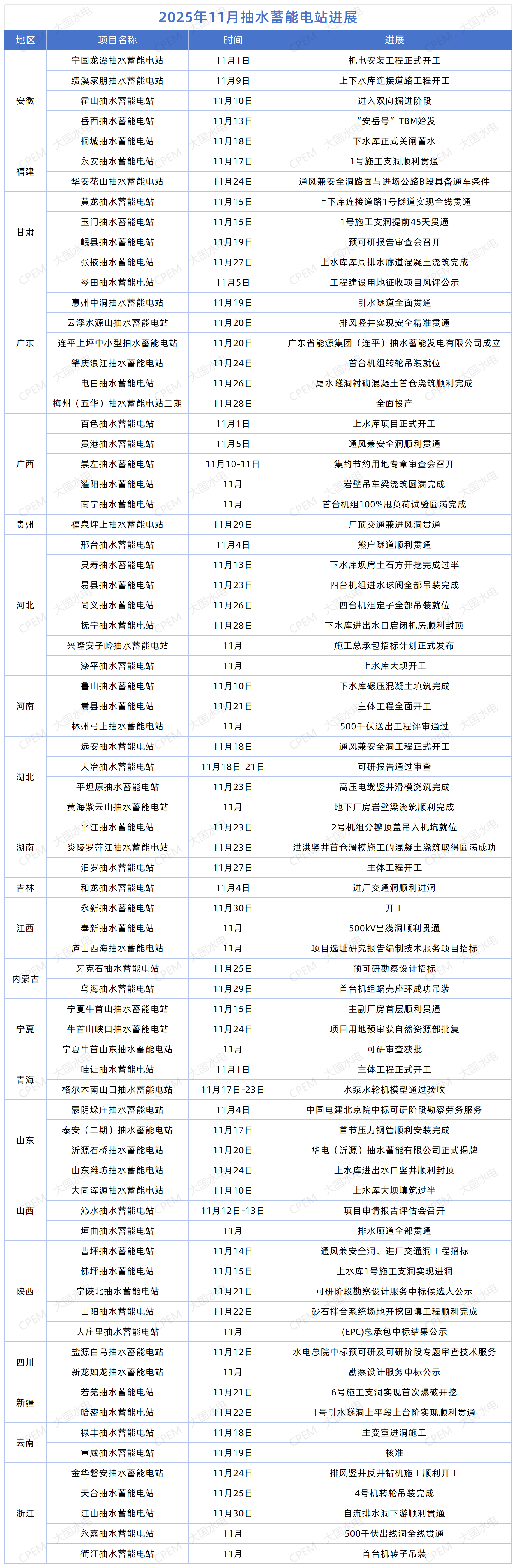 2025年11月,全国75座抽水蓄能电站取得重要进展,涵盖开工、投产、核准、可研审查等。其中梅蓄二期全面投产,永新抽蓄开工,宣威抽蓄核准,湖南汨罗抽蓄、青海哇让抽蓄、河南嵩县抽蓄等电站主体工程开工,具体如下:
