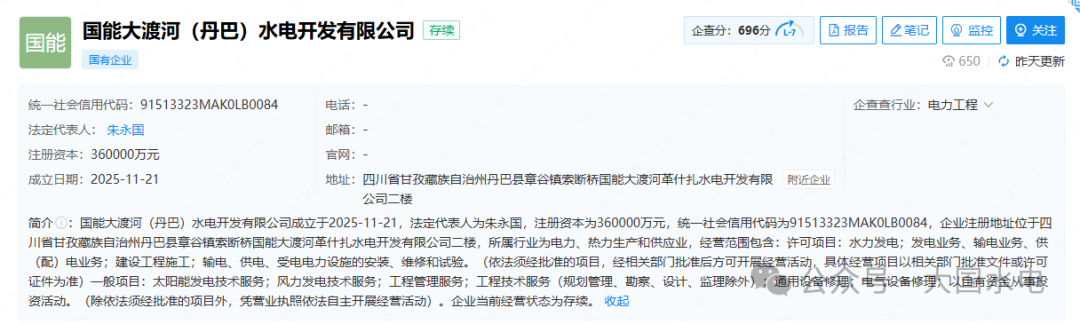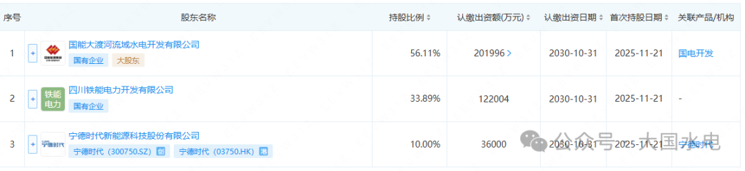 11月21日,国能大渡河(丹巴)水电开发有限公司成立,注册资本36亿元,法定代表人朱永国。股东及出资信息显示,该公司由国电电力旗下国能大渡河流域水电开发有限公司、四川铁能电力开发有限公司、宁德时代新能源科技股份有限公司共同持股。国能大渡河流域水电开发有限公司持股56.11%,宁德时代新能源科技股份有限公司(以下简称“宁德时代”)持股10%。